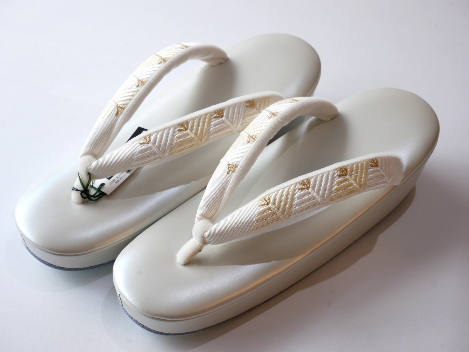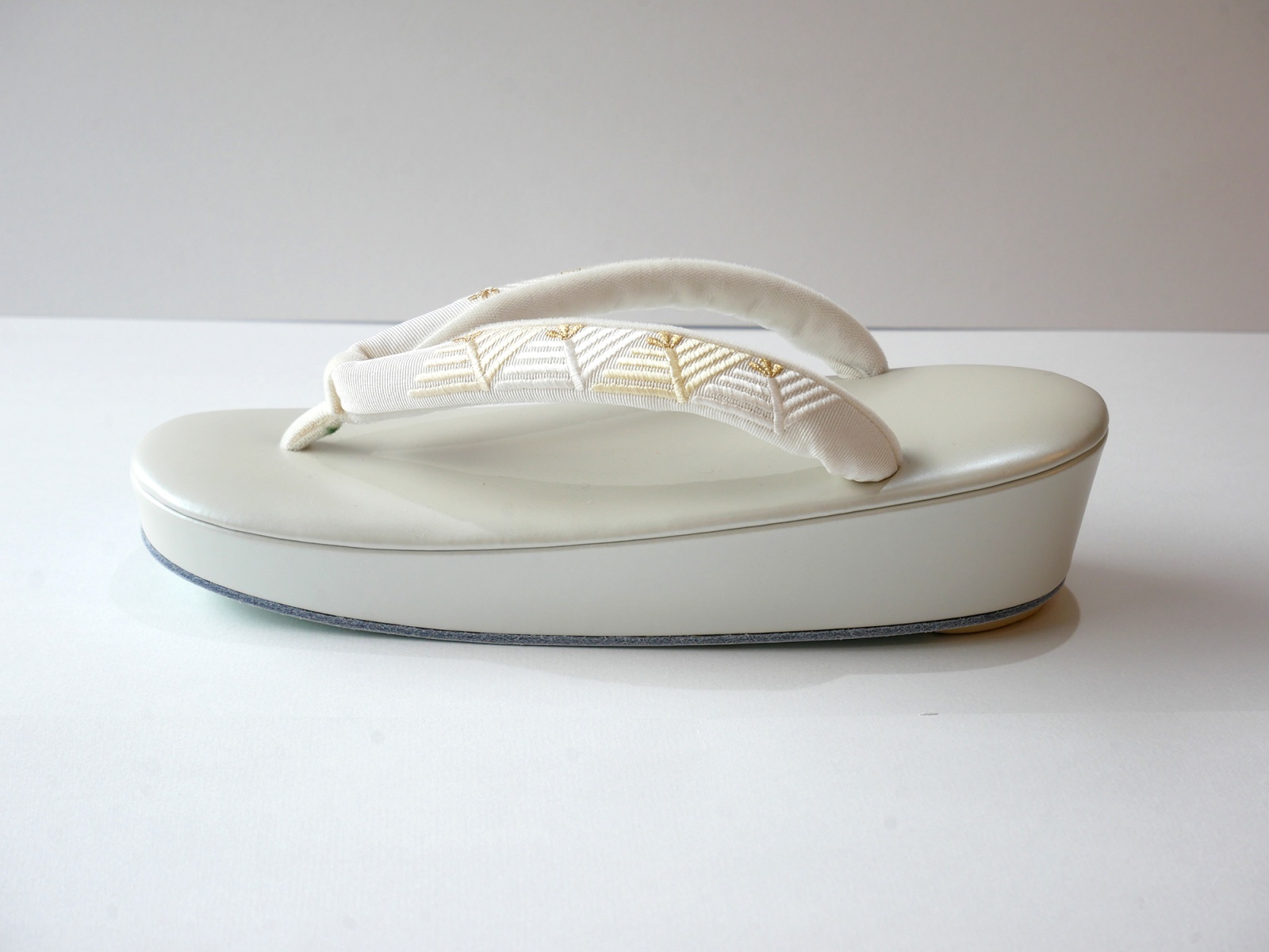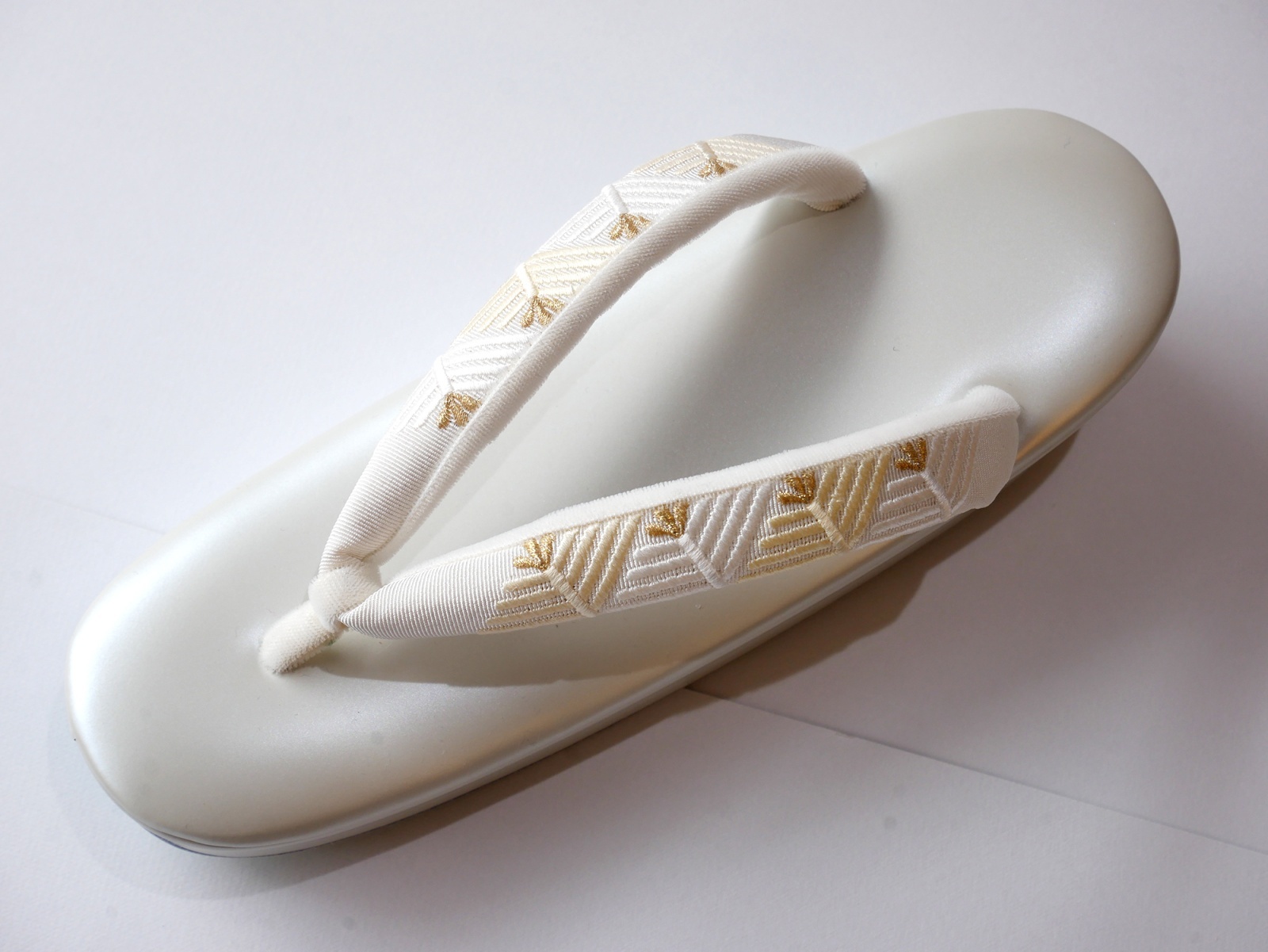 ふっくらとした刺繍が施された鼻緒にパールホワイトの台が上品な草履です。