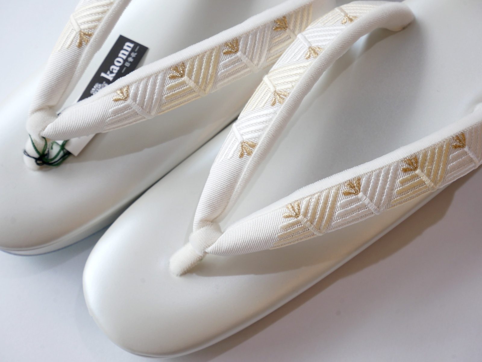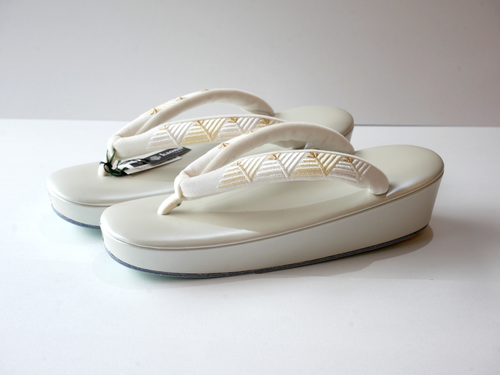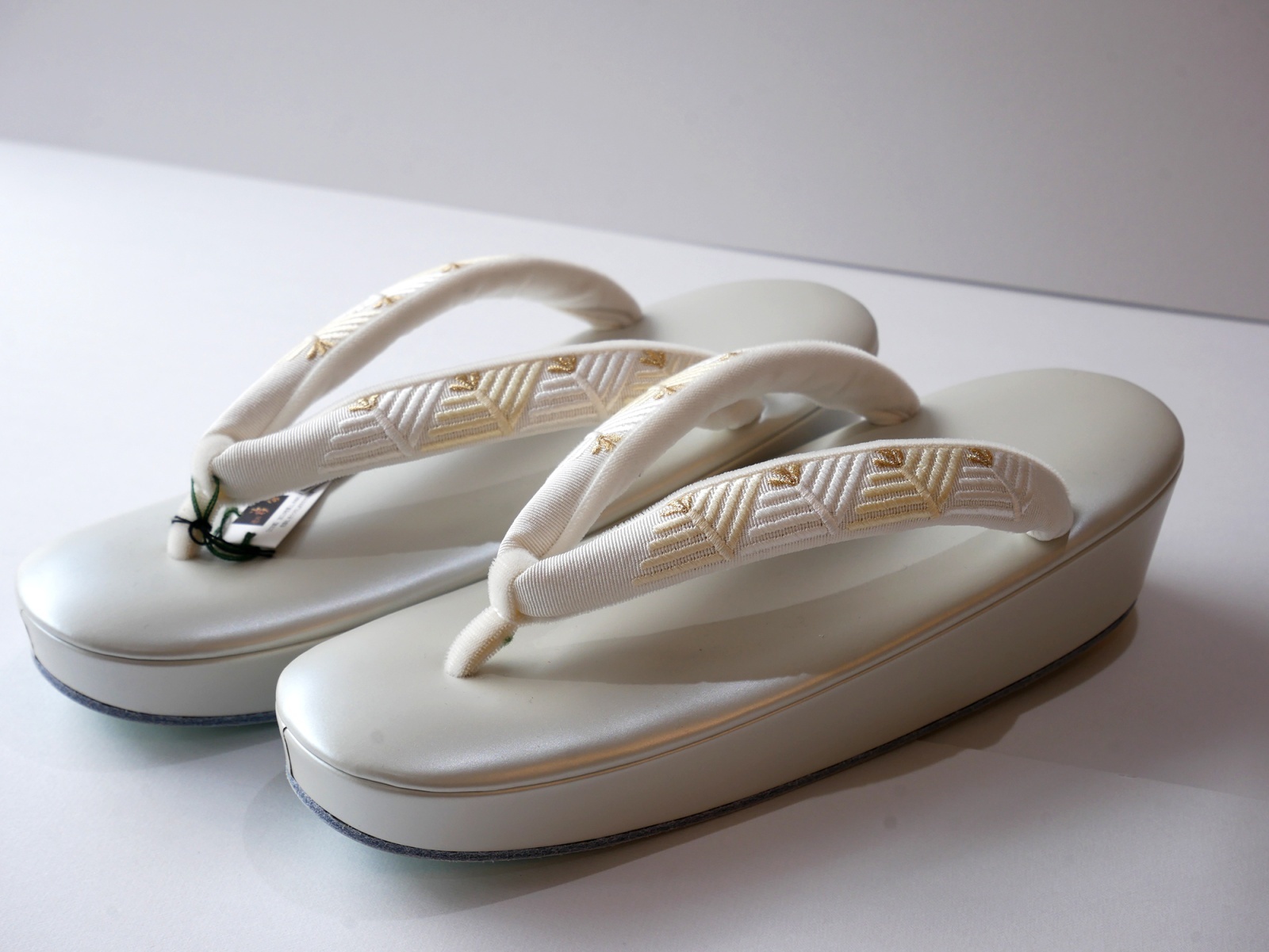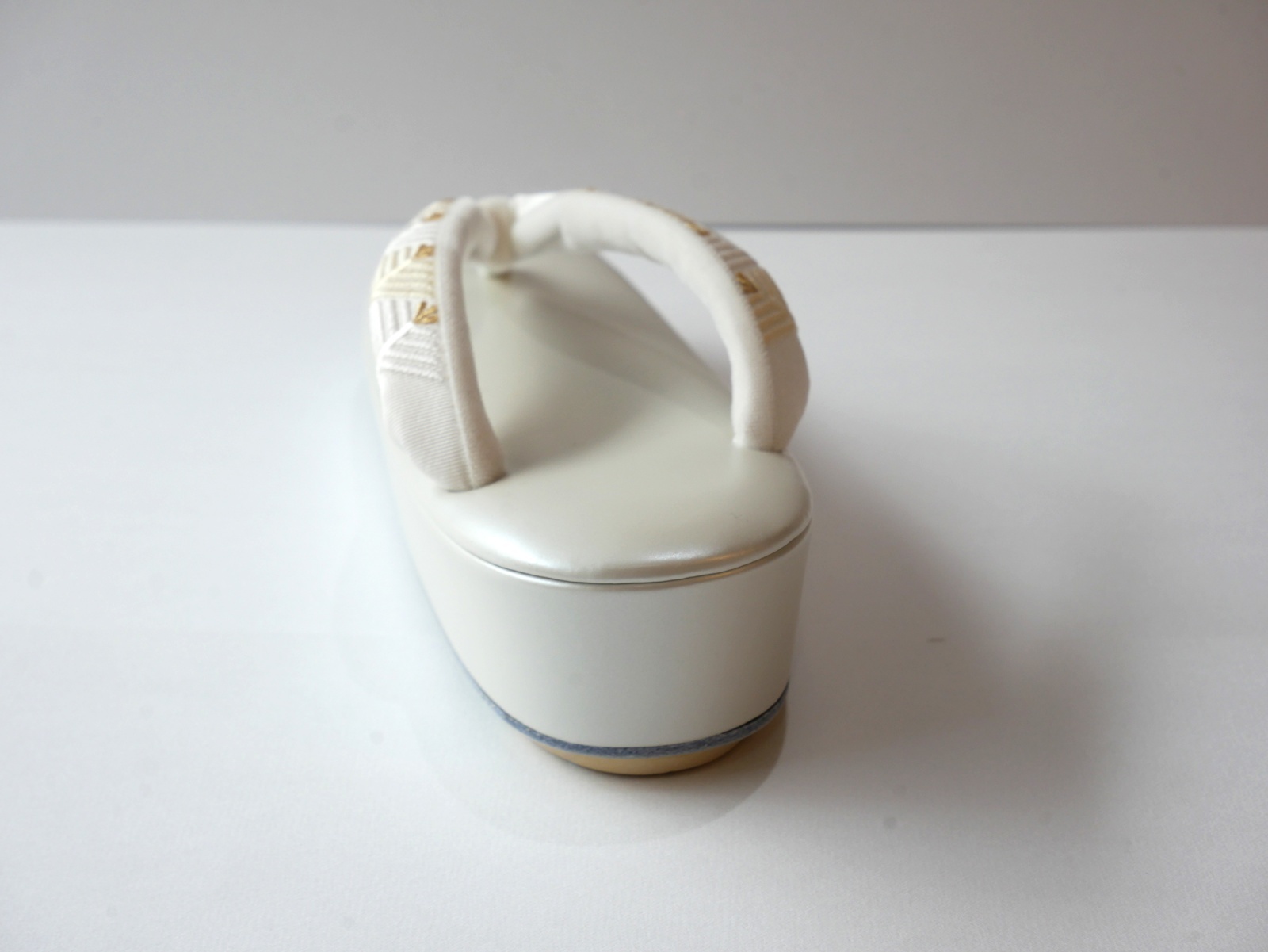 ふっくらとした刺繍が施された鼻緒にパールホワイトの台が上品な草履です。